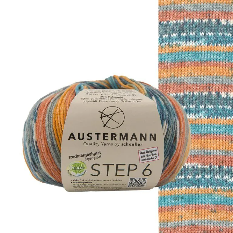 La laine à bas Step d’Austermann est une laine fabriquée en Allemagne qui est d’une grande qualité. La fibre contient également de l’huile de jojoba. Une balle de 150 grammes est suffisante pour une paire de bas ou chaussettes d’adulte.
