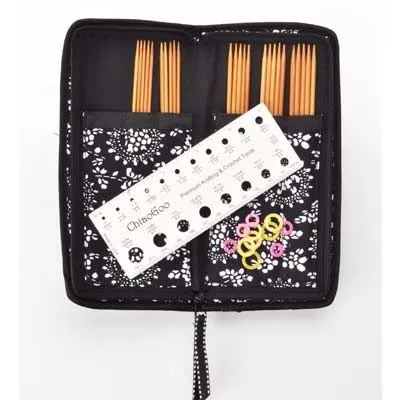 Cet ensemble de d’aiguilles doubles pointes en bamboo de Chiaogoo comprend cinq ensembles de 6″ (15 cm) de pointes doubles dans les tailles US1 (2,25 mm), US1,5 (2,5 mm), US2 (2,75 mm), US2,5 (3,0 mm) et US3 (3,25 mm), 12 marqueurs de mailles, une jauge d’aiguille de 5″ (13 cm) et un étui en tissu compact fermé par une fermeture éclair avec une poche extérieure zippée.